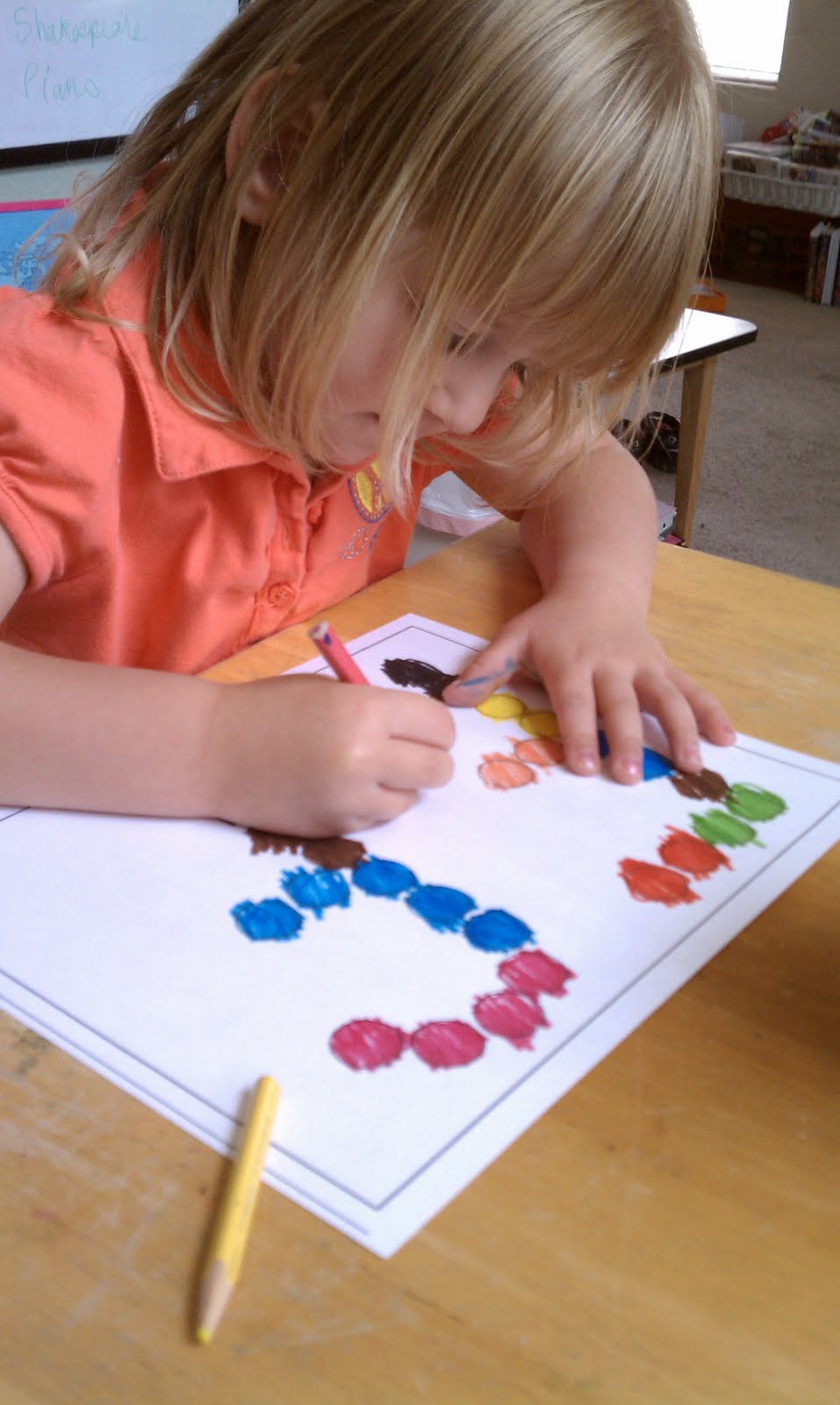 For table work we did a few different letter F worksheets. I had no sticky dots left so I just had them color that one in with markers. Freddie scolded Flossie about using different colors within one letter. He said she was supposed to use only one color per letter. She gave him a disgusted look, no comment, and went on doing what she was doing. :) Two others were practice writing letter F. And one was finding large and small F's on the page. They always seem to like doing these, and do well with them.
