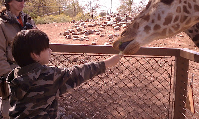 In February we took a trip with Grammy and Papa to the Zoo! The weather was great and we all had a fun time. We must have since we were there for over 5 hours! When we first got there, Jem was running around and somehow ran head first into the metal bar on the SEAT of the tables we were sitting at. He immediately got a golfball size bump on his forehead and started crying that he was going to die! Great! Luckily we had an ice chest and ice and he was fine. Kettle corn. Hot chocolate. Crisis averted. Later, Jem got to feed the giraffes. He was not impressed. All they let him do was hold out a piece of lettuce which it quickly snatched up. They only let me (the adult) feed it the pellets which allowed me to feel the sandpapery tongue. He was kind of bummed about the whole thing. Oh well. Sarah insisted on pulling the fairly heavy wagon full of our lunches and an ice chest through most of the zoo. Not sure why. I finally had to insist it was someone else's turn just to give her a break. Our favorite part was the orangutans which were a riot this time. The young one was really giving his grandma a hard time, and the father kept having to break the two of them up. It was a real soap opera. Since the weather was so nice, a lot of the animals that usually are not out, were out walking around. The kids insisted on me taking their pictures in front of the kit fox because we almost never see them up and about. AND I saw the cheetah walking around and going poop! A real live cheetah pooping! You don't see that very often! Here are some pics from the day: